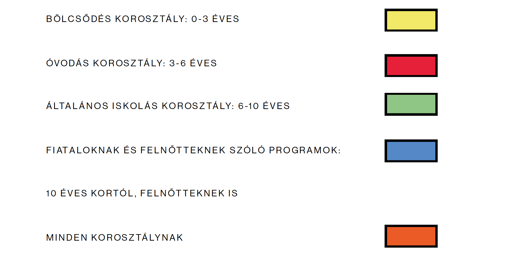 A programokat négy korosztálynak szánva állítottuk össze, amiket színekkel is jelölünk:
